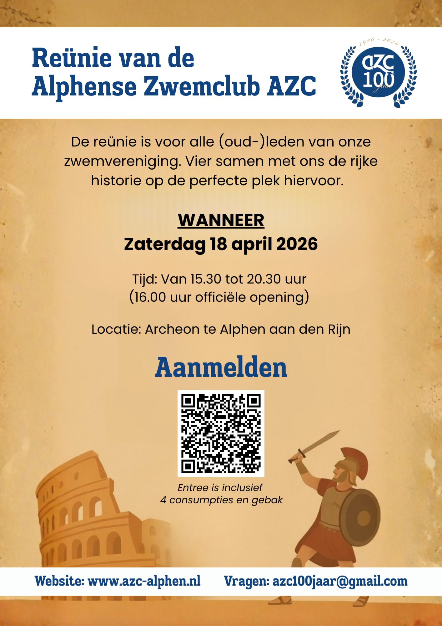 Op zaterdag 18 april 2026 organiseert de Alphense Zwemclub AZC een bijzondere reünie in het Archeon. In het kader van ons 100-jarig jubileum nodigen we alle (oud-)leden én iedereen die de club een warm hart toedraagt van harte uit. Dit is hét moment om herinneringen op te halen, oude bekenden te ontmoeten en samen stil te staan bij een eeuw vol sport, vriendschap en verbondenheid. De reünie belooft een inspirerende en gezellige middag en avond te worden, waarin verleden en heden samenkomen ...